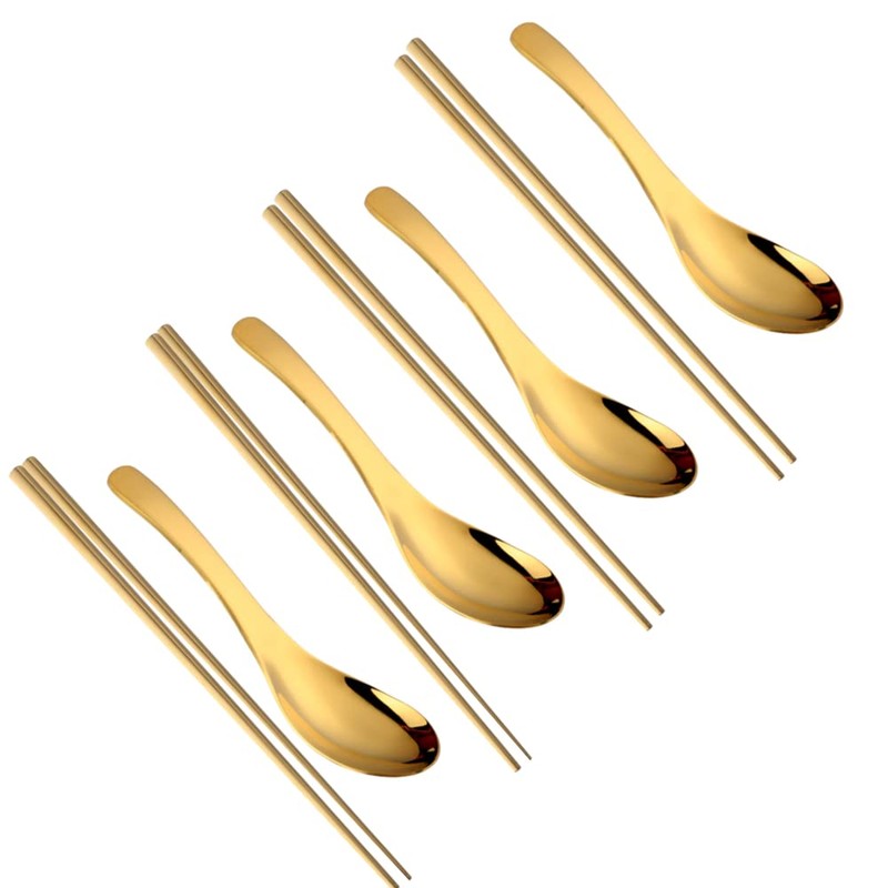 Juego de cucharas y palillos chinos de metal para 4 personas, reutilizables, de acero inoxidable, con mango corto, asiático, regalo de Navidad, apto para lavavajillas (dorado)