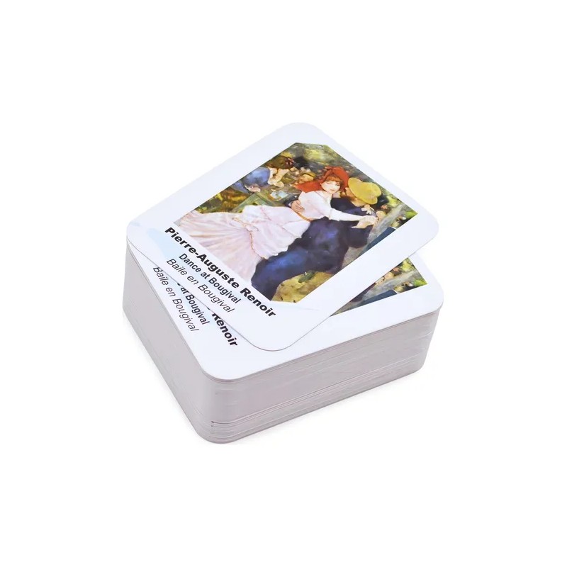 El Juego de Memoria de Obras de Arte incluye 70 tarjetas con 35 pares de reconocidas obras de artistas como Van Gogh, Renoir, Degas, Vermeer y Da Vinci. Cada tarjeta de cartón plastificado mide 8 x 6.5 cm y tiene puntas redondeadas para mayor seguridad. Las imágenes de las obras vienen acompañadas del nombre del artista y el título de la pintura en inglés y español.