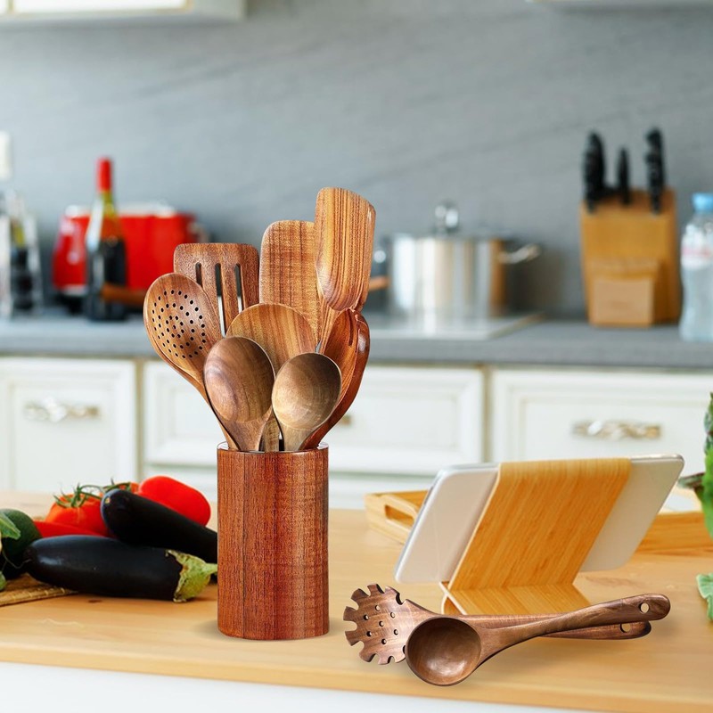 Juego De Utensilios De Cocina De Madera, Utensilios Para Cocinar, 10 Cucharas Y EspáTulas De Teca Natural, Para SartéN Antiadherente (Marrón-1pcs)