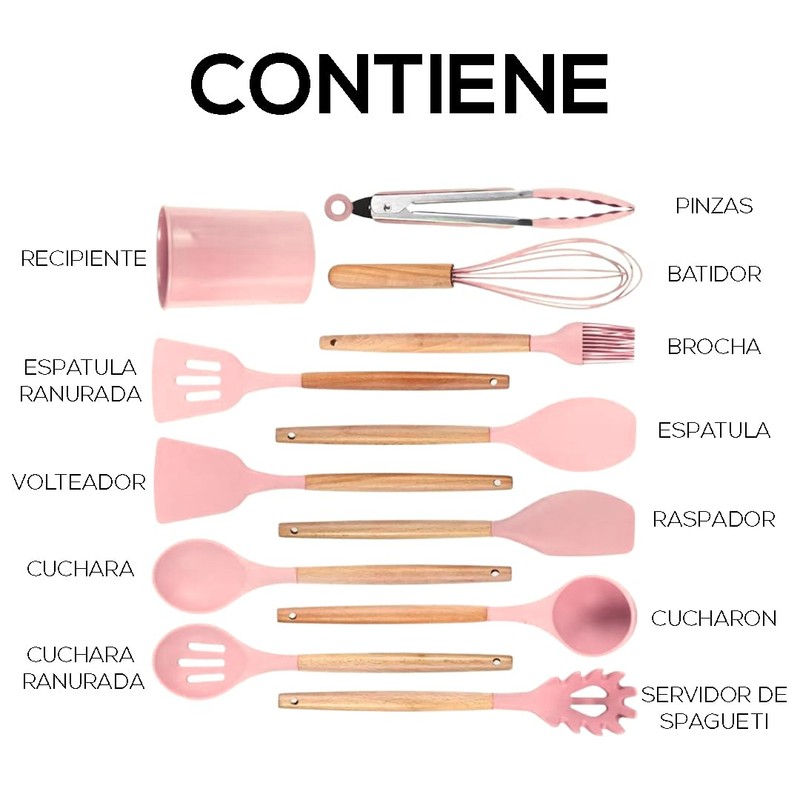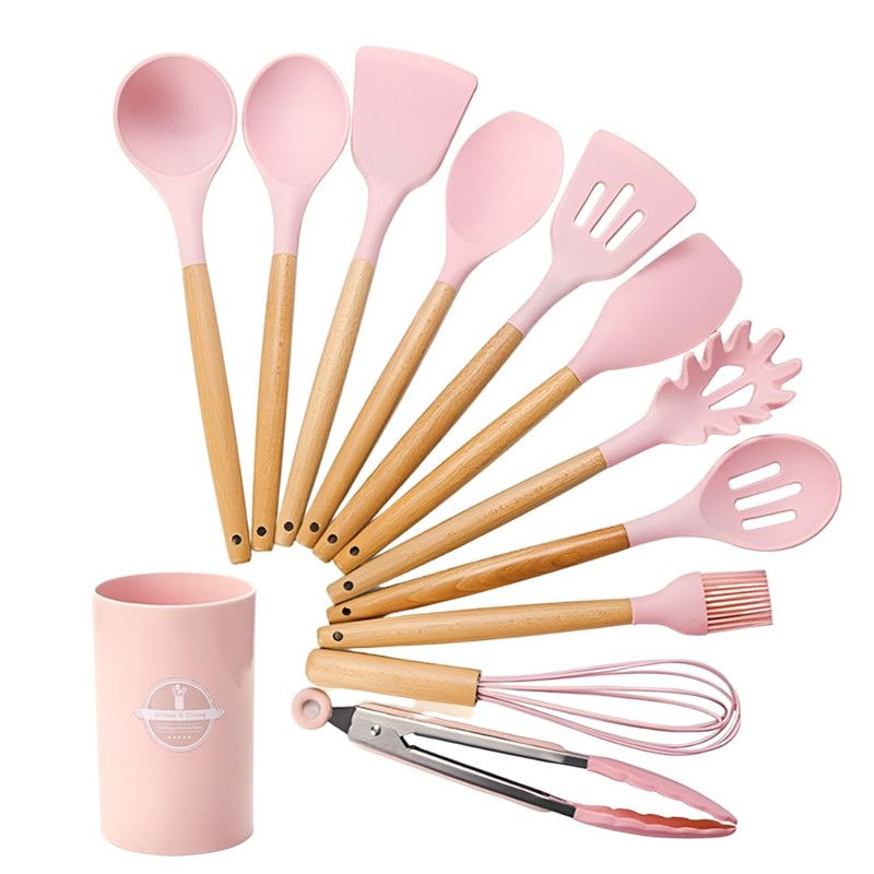Juego de Utensilios de Cocina | Kit 12 Piezas de Cocina | Set de Instrumentos de Silicona | Mango de Madera Resistentes | Herramientas de Cocina Multifuncionales (Rosa)