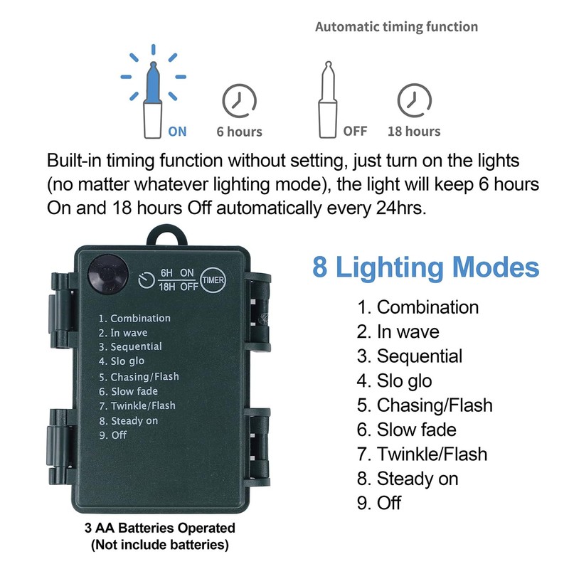 - 8 Lighting Modes & Timer Function: The light has 8 lighting modes for you to choose - Combination, In waves, Sequential, Slow Glow, Chasing/Flash, Slow fade, Twinkle/Flash, Steady on. Comes with built-in auto timer function, just adjust the lighting modes by pressing the round button on the waterproof battery box, it will keep 6 hours On and 18 hours Off auto every 24hrs, to avoid forgetting to turn off the Christmas lights