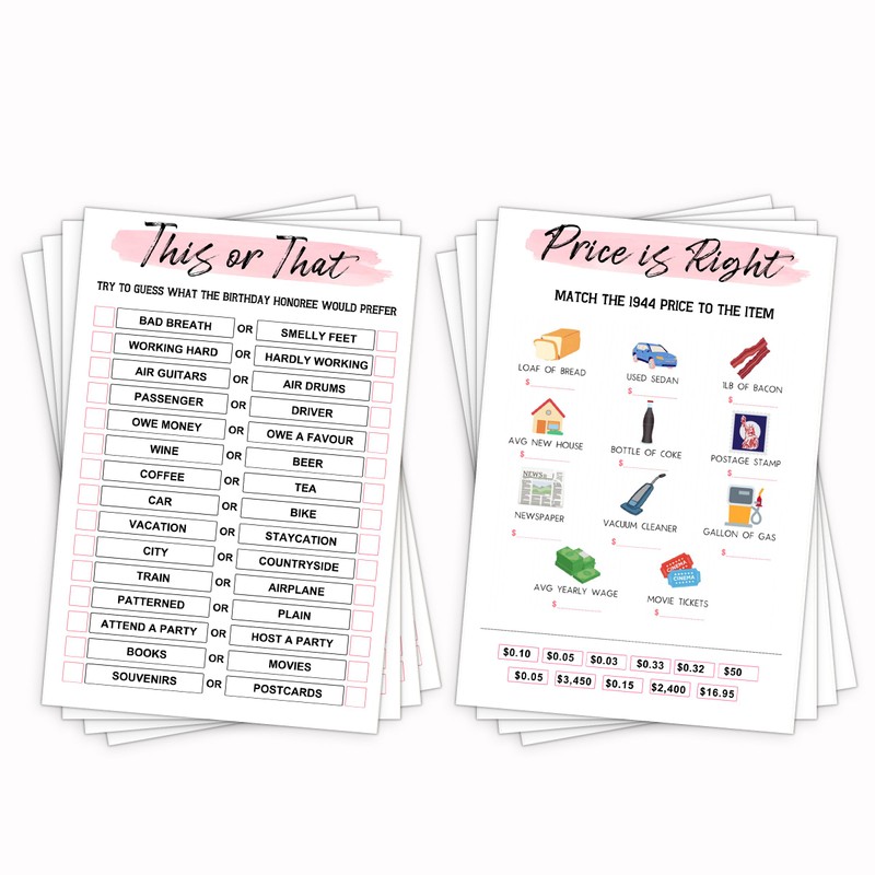 - Lo que obtienes: el paquete de 80 juegos de cumpleaños incluye "Price is Right" "This or That" y las tarjetas de respuestas.
