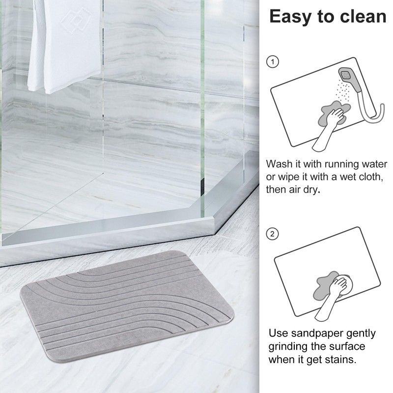 - 5. Easy to Clean - Compared to traditional bath mat, no daily washing needed. When it get stains, just wash it with running water or wipe with a wet cloth, or use sandpaper gently grinding the surface when necessary, then air dry. Our Diatomaceous Earth bath mat will quickly refresh itself with excellent absorbent performance.