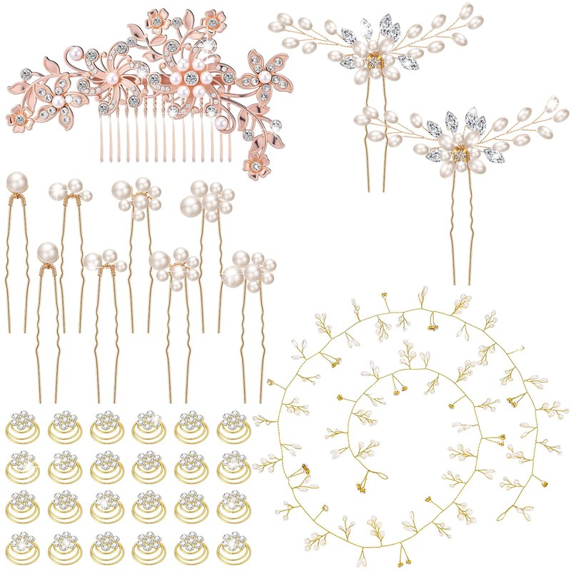 - Easy Matching: includes 1 piece hair vine measuring about 1 m/ 39.4 inches long, 2 pieces U shape wedding hair pins, 24 pieces spiral hair pins in 4 styles, 1 piece bridal side comb and 20 pieces pearl updo forks in 4 styles, sufficient quantity and assorted styles, easy to match your different hairstyles by wearing the wedding hair accessories for brides