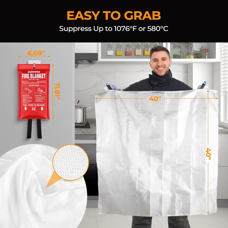 - SAFE AND RELIABLE - The emergency fire blanket consists of two layers of 100% fiberglass braid and an inner flame retardant film. It meets EN-1869:1997 standards for isolation from temperatures up to 1076 ° F (580 ° C), cuts off the oxygen supply to the flame, and extinguishes liquids, grease, and all types of fires.