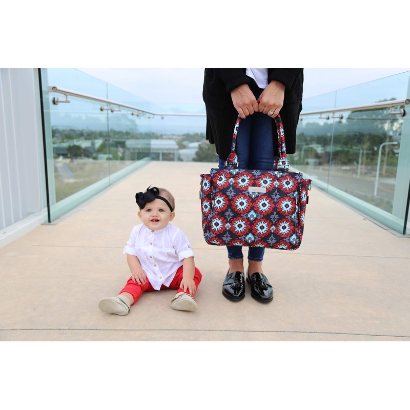 The JuJuBe Be Classy Diaper Bag is like you - a class act. You might spend a majority of your days covered in baby food or picking up the playroom for the 100th time, but have no doubt: you are still the same classy woman you have always been and will always be. Which is why we want to thank you for the inspiration behind this bag design. Thanks to the feedback from our talented fan base we were able to create the Be Classy: a bag that is a testament to the spirit of the Pink Ladies that make JuJuBe great, and the standard to which we always strive. A bag that is not only one of our most functional, tailored designs, but also possibly the most timeless. With its sleek design and adjustable messenger strap or structured handbag style carrying options, the Be Classy is the perfect culmination of your favorited JuJuBe features. A bag so functional you will bring it on your first outing with your newborn, and one so elegant you will carry it well after the diapering days are done. The front "mommy" pocket features a key fob, microfiber glasses pocket and a quick-reach cell phone pocket with room for more of your personal belongings. The main zipper pocket is large enough for diapers, wipes, extra clothes and other items. Keep organized inside with 3 gusseted pockets and 1 zippered pocket. The back pocket is designed with crumb drains to keep this area clean and includes a super cushy memory foam changing pad. The two insulated pockets use 3M Thinsulate to keep beverages hot or cold. Sweet Scarlet…one part hopeless romantic, one part modern diva. Sound familiar? Graced with brilliant pops of modern color, this classic print reflects the complexity in us all. Bold red florals catch the eye, while tranquil blue accents softly soothe. Brushed metal hardware provides a classy touch, and a crystal blue lining pulls this sweet and sassy lady together. For your convenience, JuJuBe products are machine washable and can be left out to air dry. All JuJuBe items come with a Lifetime Limited Warranty against manufacturing defects when purchased from an Authorized JuJuBe Dealer. Founded in 2005, JuJuBe is a Southern California company that uses science, style, and attitude to create diaper bags, purses and other fashionable accessories. JuJuBe assimilated the most advanced technology possible to create a stylish and intelligent product line that's unrivaled in the industry.