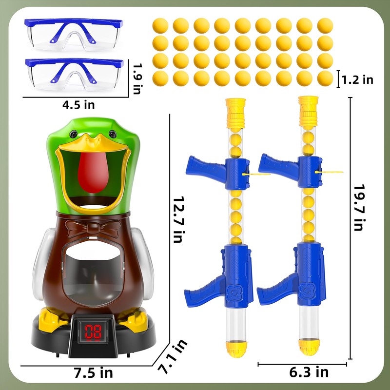 - Duck Shooting Toy: The feeding duck game includes 1 duck toy(7.5*7.1*12.7 in) with movable wheels and scoreboard, 36 toddler balls, 2 air-pumps toy for interactive game for kids ages 4-8. Suitable for boys girls 3-5 and family game for kids 4 and up