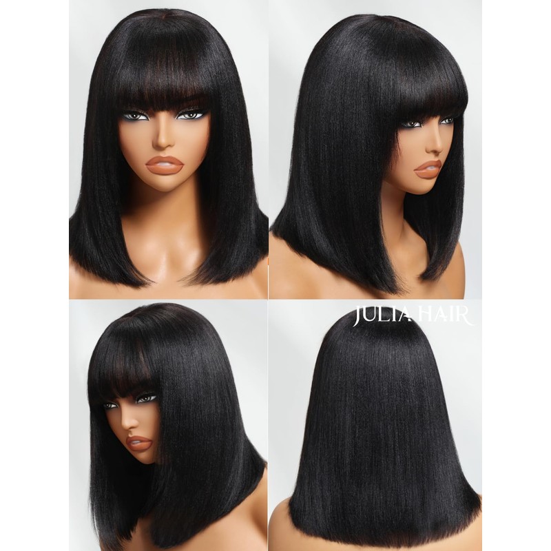 Julia Hair 10 Inch Light Yaki Straight Bob Wig with Bangs Human Hair Glueless 2x4 HD Lace Realistic Short Black Ready to Wear Blunt Cut Bob Wigs Natural for Black Women Beginner Friendly
