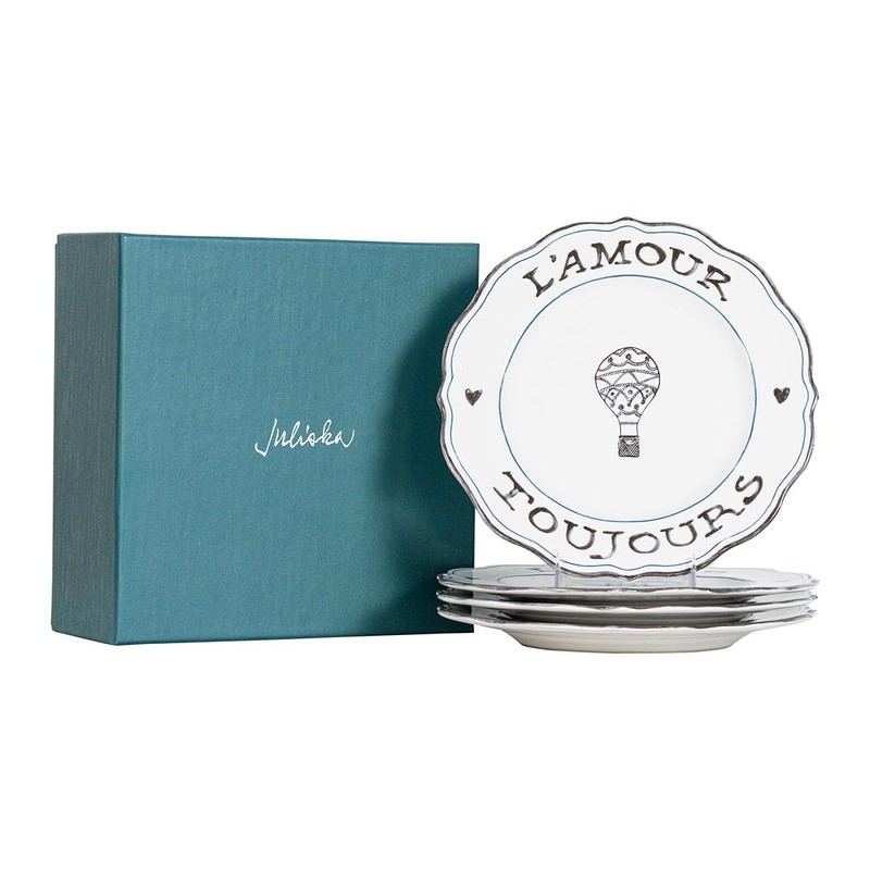 - A bold declaration of L’amour Toujours (Love Forever) is hand sketched around the scalloped rim of this unabashedly romantic dessert/salad plate, making it a stunning silhouette for layering upon other dinnerware pieces. A pair of hearts and a hot air balloon remind us to share love wherever our entertaining adventures may take us, from a slice of homemade tarte tatin with coffee for a scrumptious breakfast in the garden, to a petite salad verte served under the stars for a moonlit dinner party. Gift boxed.