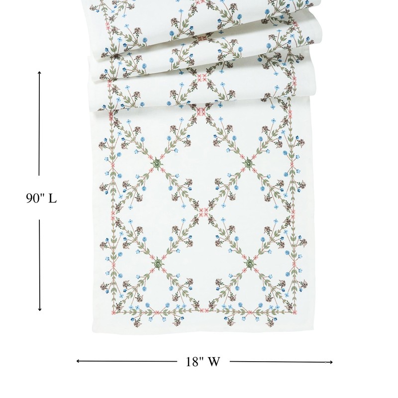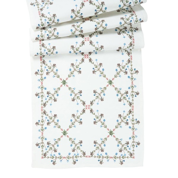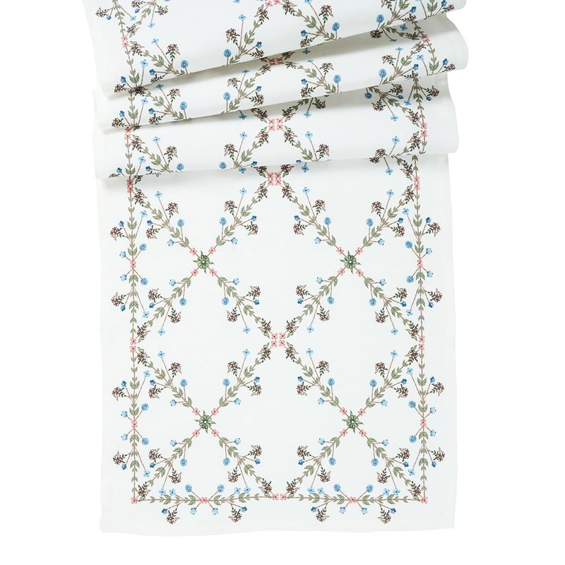 - With pure white linen as fresh as cream and a delightful lattice motif of folkloric wildflowers in greens, blues and pinks inspired by the Spanish countryside, this table runner enlivens any table setting and mixes and matches like a dream. Perfect for spring brunches, breezy summer lunches and imagined tea parties with Marie Antoinette (we could not resist).