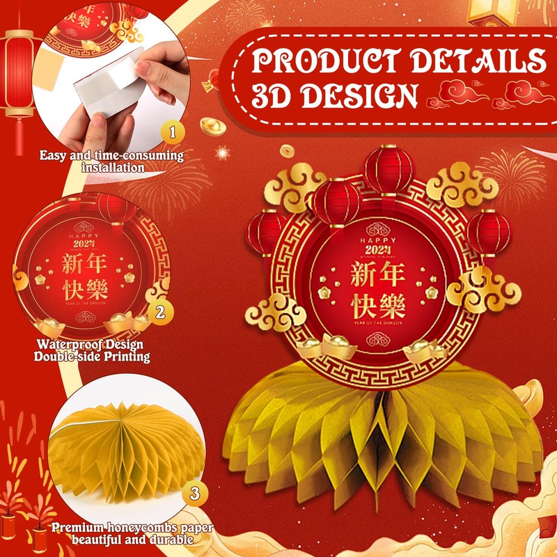 - Simple to Assemble: Step 1, tear off the sticker of the honeycomb ball. Step 2, sticking the honeycomb balls in the fixed area of the card. Step 3, repeat on the other side of the card. Step 4, finally, put Chinese new year decorations 2024 on the table, which is easy to assemble and saves a lot of time. Just put the finished lunar new year decorations 2024 on the party table, which can enliven the atmosphere of the party and let you enjoy a wonderful party time