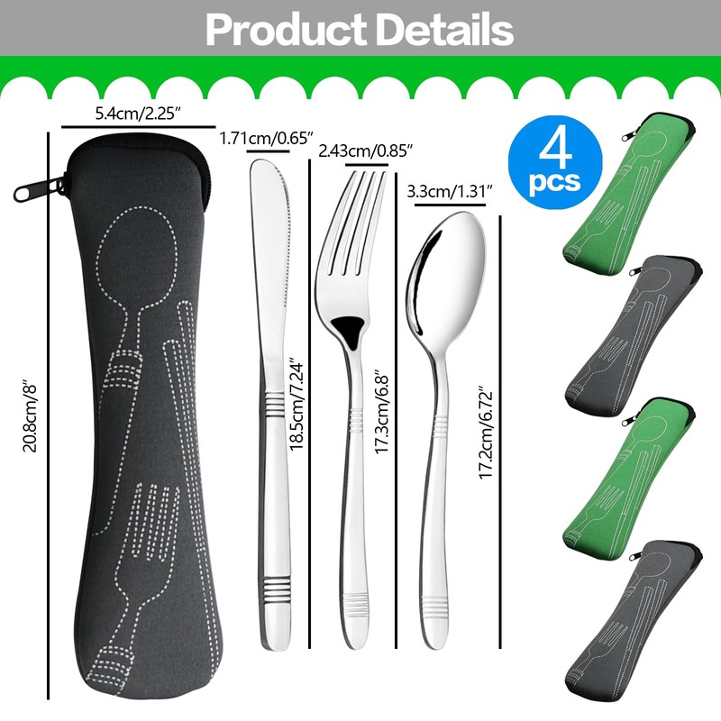 • Stainless steel utensil set: Include 4 sets of travel utensil set with case, included 4 forks, 4 knives 4 spoons and 4 cases