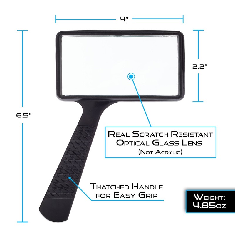 Jumbo Rectangular Handheld Magnifying Glass (3X Magnification) – Scratch Resistant Glass Lens - Large Horizontal Viewing Area