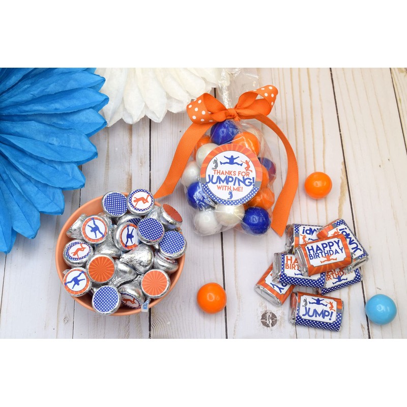 *** Bigger... Better... and Best of All... Cuter. Presenting Jump Zone Bounce and Play Trampoline Park Jumping Birthday Party Sticker Bundle Kit! Designed by a Mom for Moms. Complete sticker party pack includes 60 2” circle stickers, 45 mini candy bar wrappers and 324 kiss stickers ***