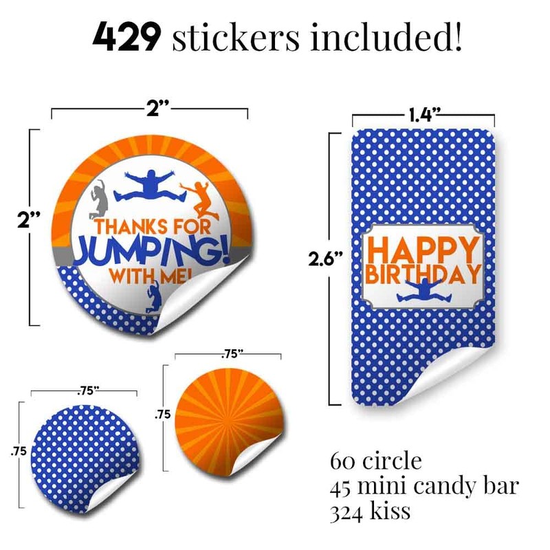 Jump Zone Bounce and Play Trampoline Park Jumping Birthday Party Sticker Bundle Kit 429 pieces!!! Includes 60 2 Circle Stickers for Favors & Goodie Bags, 45 Mini Candy Bar Wrappers, & 324 Round