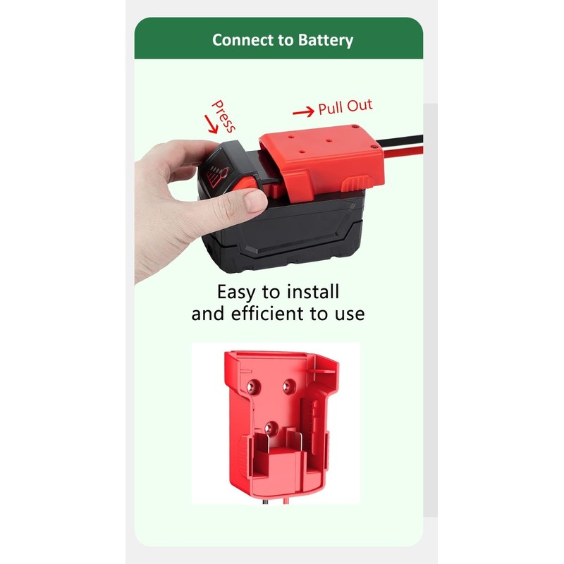 - [Installation Instructions] This jumper adapter is easy to install and adjust, 1. Connect the red battery clamp of the jumper cable to the vehicle's positive terminal (+) and the black clamp to the negative terminal (-). 2. Plug the battery into the adapter and make sure it is securely locked 3. Start the vehicle 4. After successfully starting the vehicle, within 28 seconds remove the jumper cables and disconnect the vehicle battery from the tool battery.