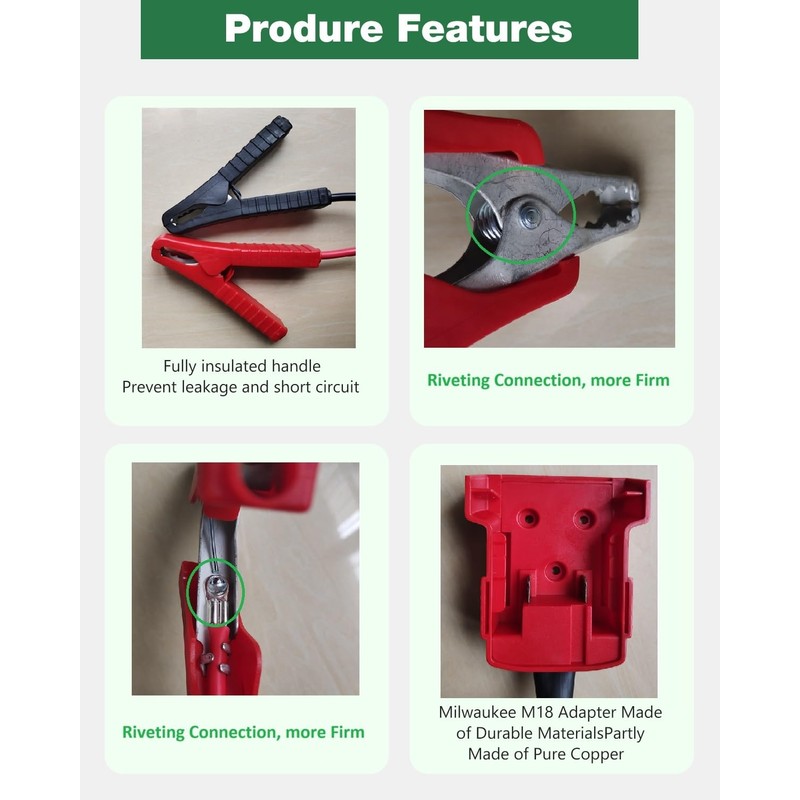 [Upgraded Clamps], Riveting Connection, more firm between clamps of this jumper adapter - [Cable Type] 1.8M/5.92FT 8AWG Tool Battery Jumper Cable. It's good for road/workshop emergency starting charger.