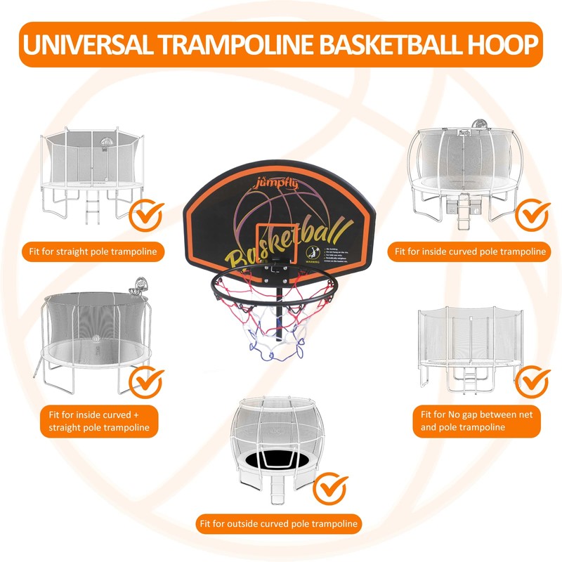 - đ ăUNIVERSAL TRAMPOLINE BASKETBALL HOOPăJumpfly trampoline basketball hoop attachment comes with a universal clamp, which works for straight poles, curved poles, arches, etc. Meanwhile, The adjustable angle board keeps the board vertical for perfect shots every time!
