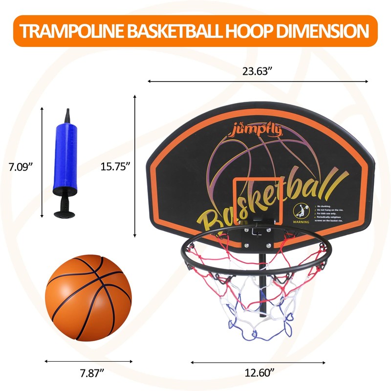 - đ ăPREMIUM & DURABLE TRAMPOLINE BASKETBALL HOOP ăCompared with a plastic basketball frame and basketball board, the Jumpfly trampoline basketball hoop made of an all-metal frame structure is more sturdy and firm, with longer service life, premium PP material, the elasticity of the basketball board is similar to the standard basketball version, giving you a better shooting experience