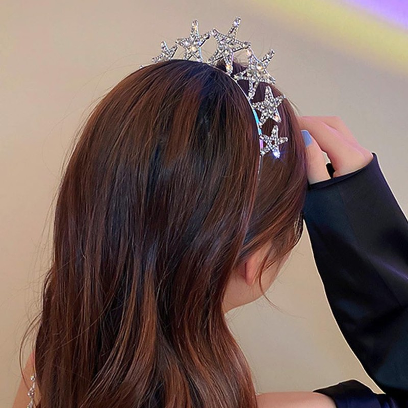 Jumwrit Silver Rhinestone Headband Glitter Metal Five-Pointed Star Headband Nonslip Thin Princess Hair Band Christmas Party Headpiece for Women Girls(Style 2)