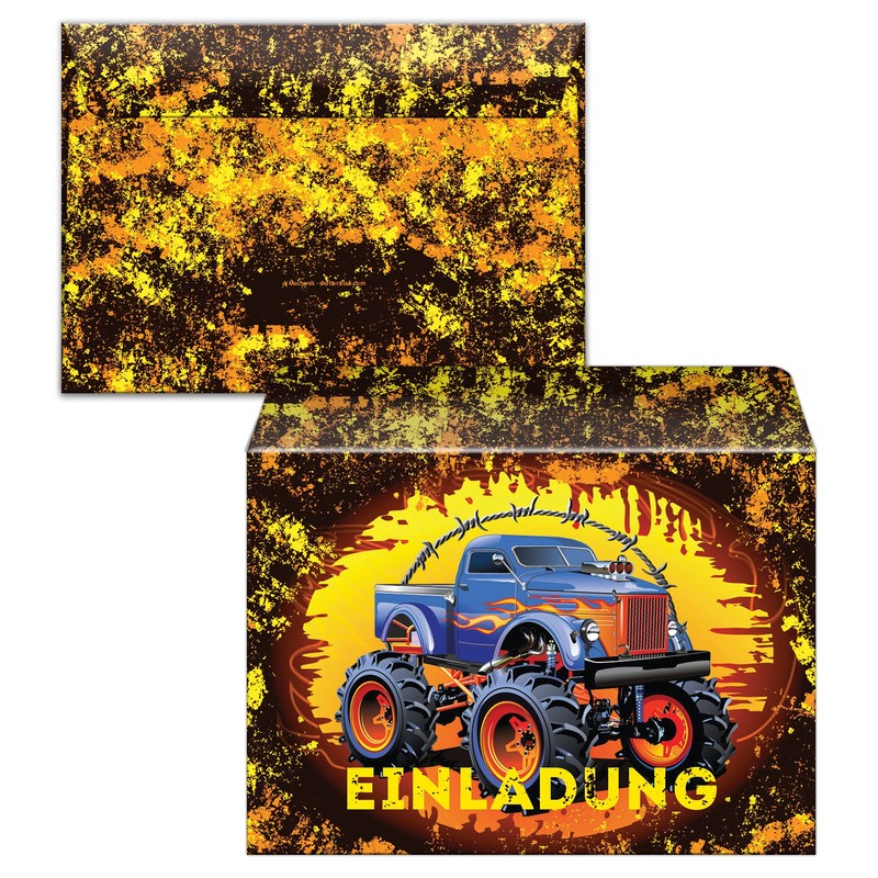 - 10 colourful invitation cards + 10 envelopes + 10 party bags with 10 stickers for birthday with the motif "Monster Truck"
