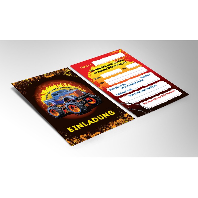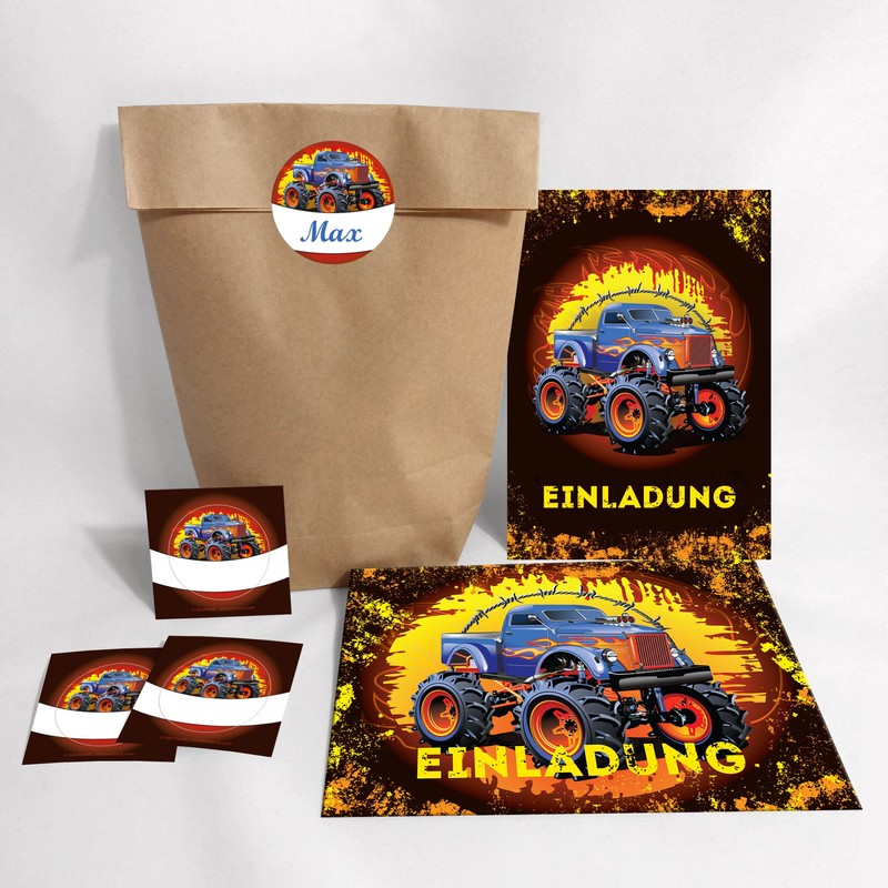 - 12 colourful invitation cards + 12 envelopes + 12 party bags with 12 stickers for birthday with the motif "Monster Truck"