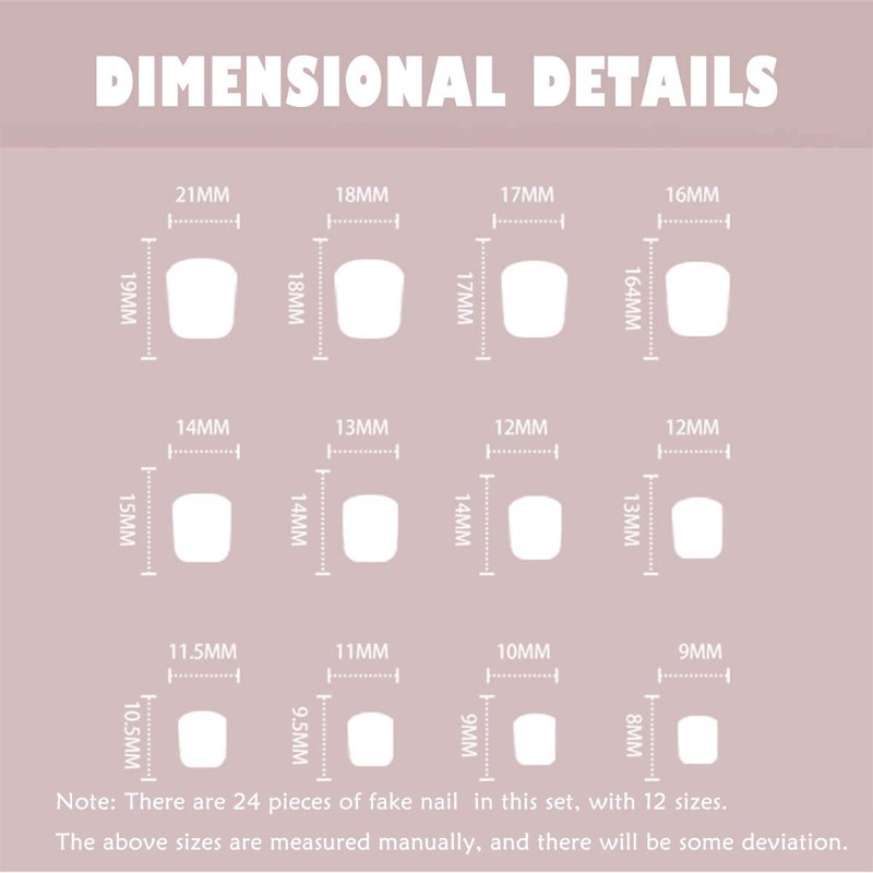 - The false nails contain 12 different sizes. No matter what your nail size is, you can choose the best artificial nails for you. And it is easy to cut them to any length and shape as you like.