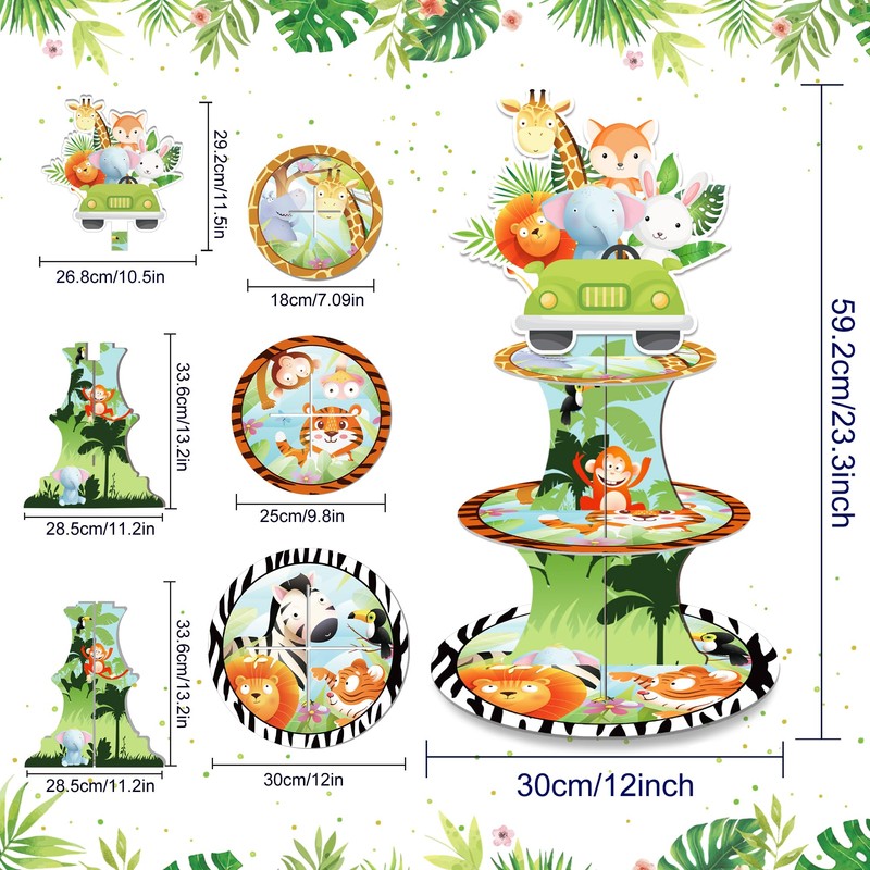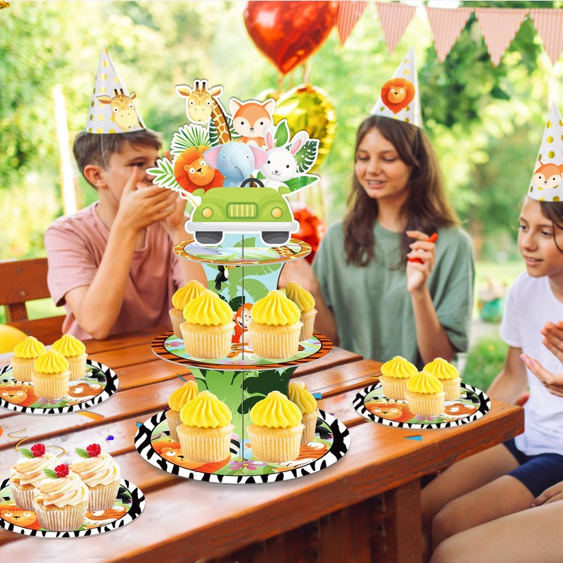 - [What You Get]:1 x safari cupcake stand Jungle Animals-themed cupcake stand, 20x Jungle Animals cupcake Wrappers. 20x Jungle Animals cupcake Topper. Buy with peace of mind! If you receive the goods have any do not like, or product the problem, we will provide you with a return service, you can contact us by e-mail