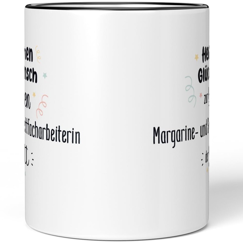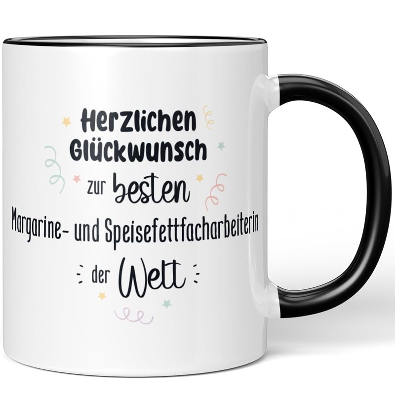 - JUNIWORDS Keramiktasse Herzlichen Glückwunsch zur besten Margarine- und Speisefettfacharbeiterin der Welt mit farbigen Henkel & Tassenrand in der von Ihnen gewählten Farbe