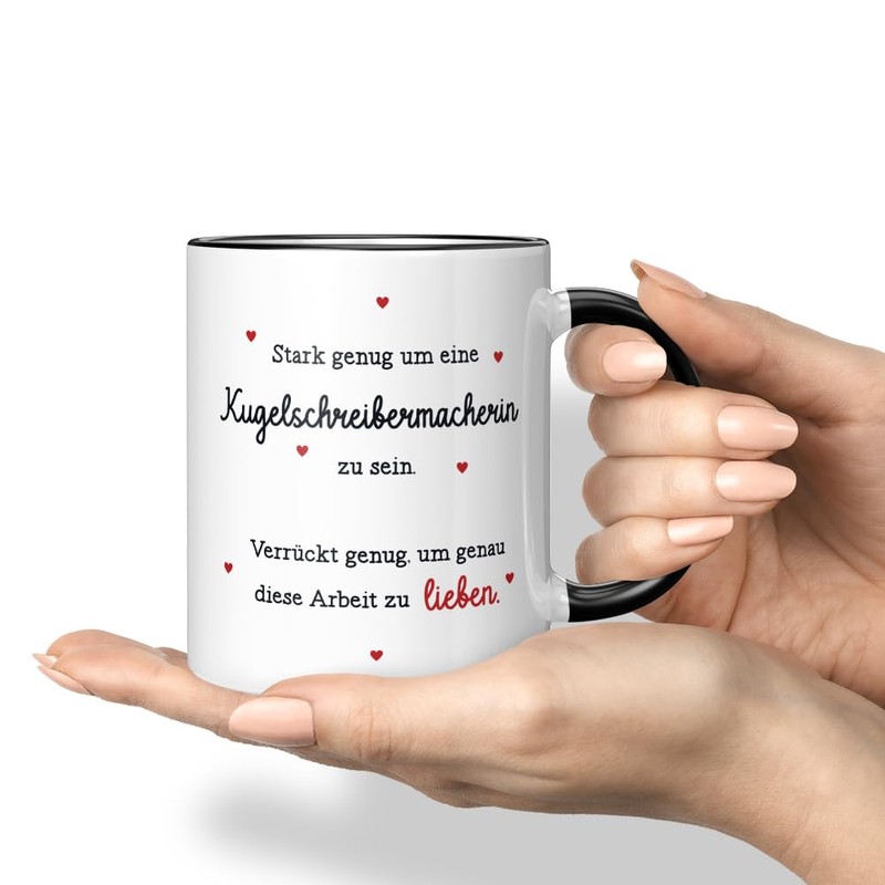 - Lieferumfang: 1x JUNIWORDS Tasse mit dem Schriftzug "Stark genug um eine Kugelschreibermacherin zu sein. Verrückt genug, um genau diese Arbeit zu lieben" in Schwarz
