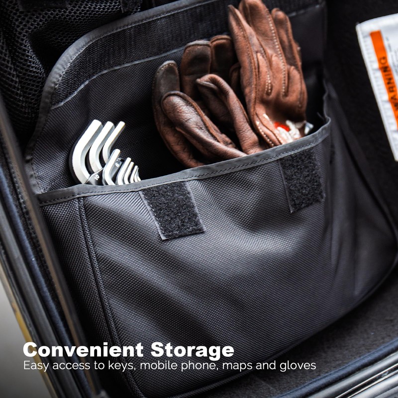 - 【Premium Material】:This tour pack Lid Fitted Lining with soft black felt finish to reduce noise, and different pockets for essentials such as maps, sunglasses, mobile phones, keys, gloves and tools