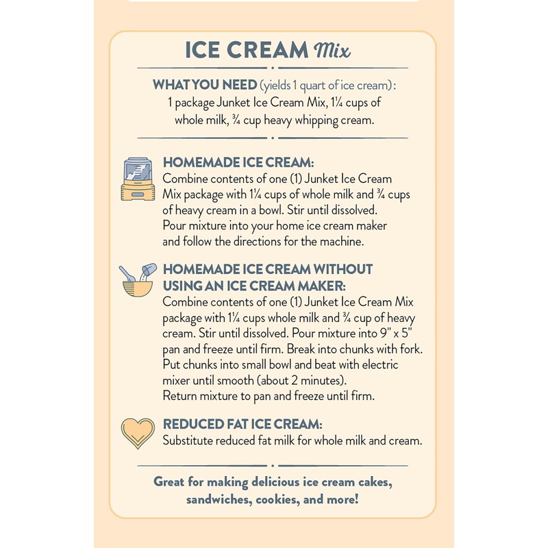 - Machine or Hand Stir: Junket Ice Cream Mix works perfectly in ice cream machines, hand cranked ice cream makers, or use our ice cream mix without a machine by hand stirring.