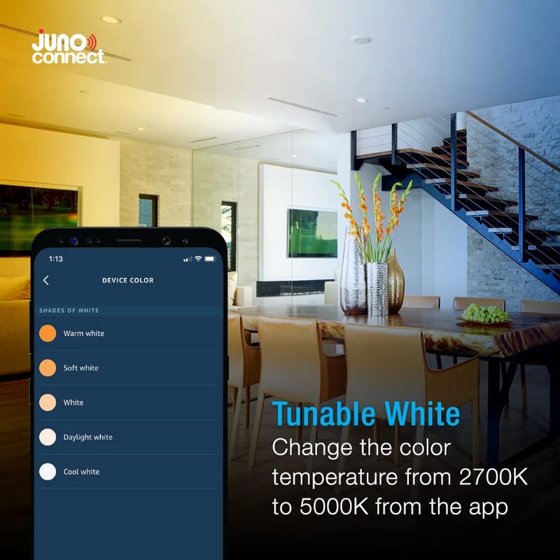 Juno WF6C RD TUWH MW CP4 M2 Smart LED Recessed Light, Wafer Downlight, 2700K-5000K Tunable White, Dimmable, Zigbee or Bluetooth, Use Alexa, Google Home, SmartThings, 6", White, 4 Pack, Matte White