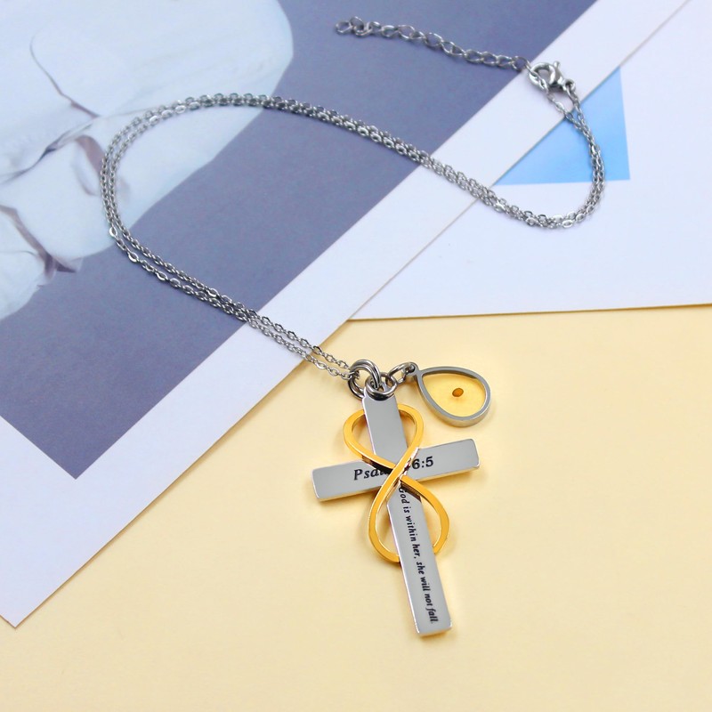 - ❶Design: This necklace includes a stunning teardrop-shaped mustard seed pendant that accompanies a polished stainless steel cross engraved with the verse "God is within her, she will not fall. Psalm 46:5." The infinity symbol surrounding the cross signifies eternal belief, while the teardrop mustard seed pendant represents growth and hope through faith.