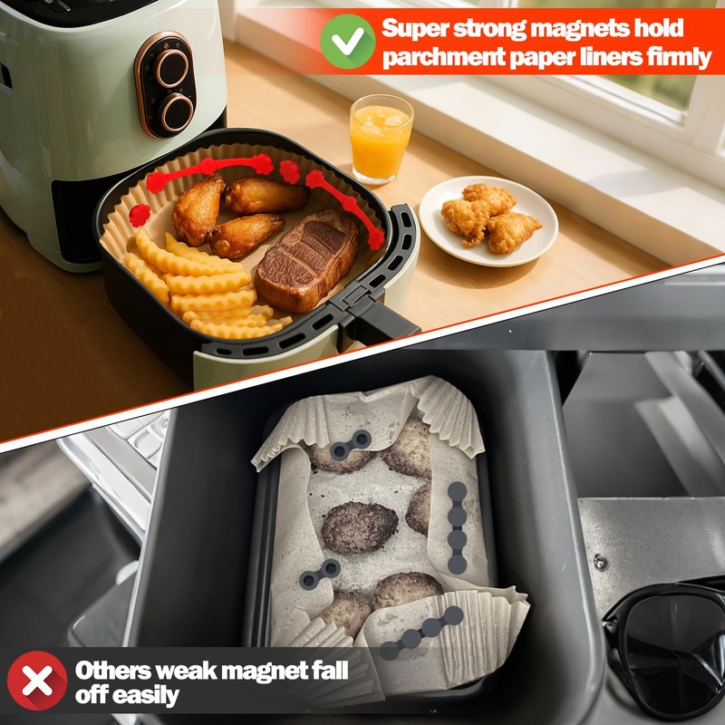 - High-Temperature Resistant Magnetic Core: These air fryer accessories magnets built-in samarium cobalt magnets increase in strength at high temperatures, keeping air fryer liners disposable firmly in place throughout cooking. No slipping, curling, or shifting—just consistent, reliable performance
