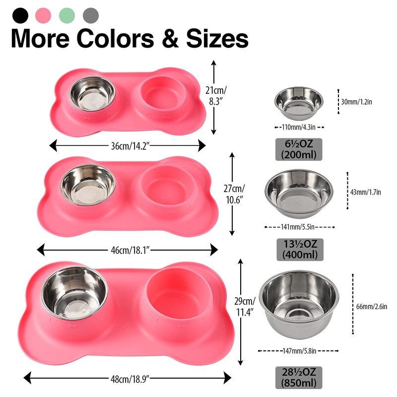 - PET BOWL SPECIFICATION: our dog bowl set includes 2 stainless 28½ fl oz(850ML) each bowls (6.1" Dia x 2.9" H) and one mat of 18.9" x 11.4" x 2.9" to feed food and water for your medium sized dog or cat