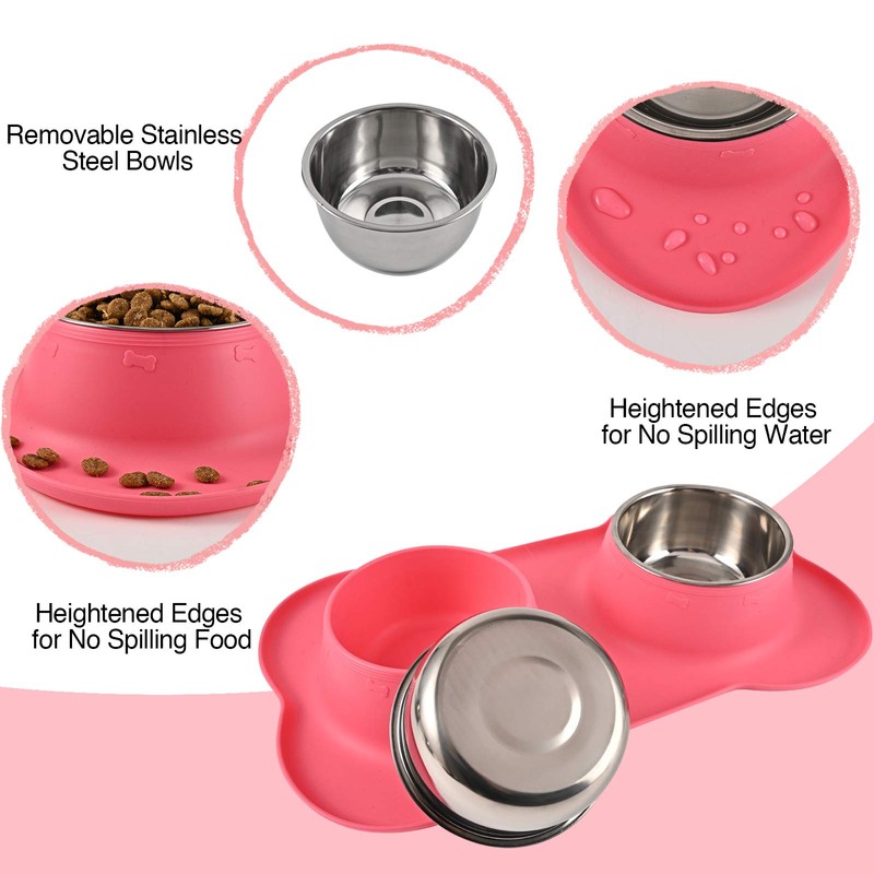 **Product Description:** Still feel headache when your destructive eater spills its food and water all over your kitchen? With the help of our specifically designed dog bowl set, you can stop the nightmare in no time! Our food & water feeder set includes 2 stainless steel bowls that resist rust and corrosion. The food degree material made bowls also ensure the safety of your pets. But the best part of the product is the Silicone Bowl Holding Mat! The edge of the mat is rolled-up to keep the spilled food and water inside the mat. It will tremendously save your work to clean the floor after your boy/girl finish their meal. The silicone mat also non slip, the bowls on the floor to avoid your pets pushing the bowls everywhere. **Product Specifications:** Overall Diameter: 18.9" x 11.4" x 2.9" Overall Capacity: 28½ fl oz(850ML) Color:Pink Gross Weight: 730G Mat Material: 100% silicone **Package Contents:** 2 x Stainless steel dog bowls 1 x Silicone bowl holder mat