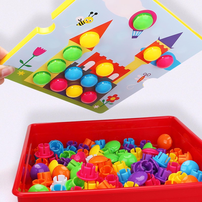 - You will receive: mosaic plug-in game 46 large beads, 12 colourful cards, storage box x 1, pegboard x 1. Mosaic plug-in game for toddlers help children recognise colours and patterns and build the relationship between mind and hands