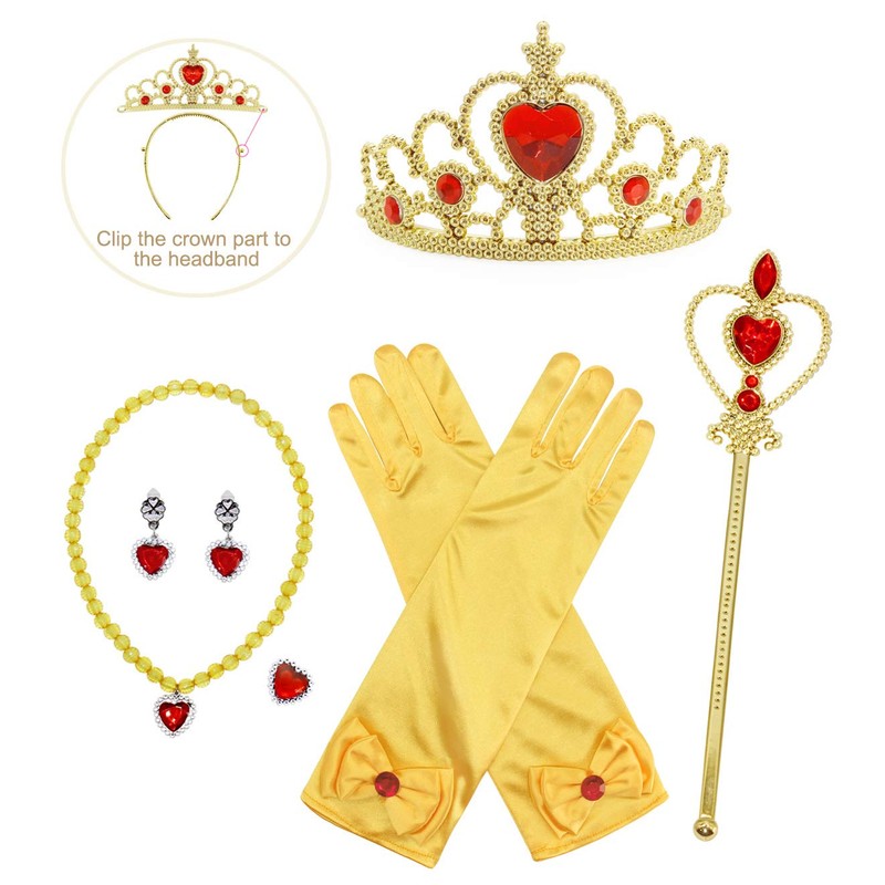 Jurebecia Belle Princess Accessories 6 pcs Costume Accessories with Crown Scepter Gloves Necklace Earrings Ring Yellow