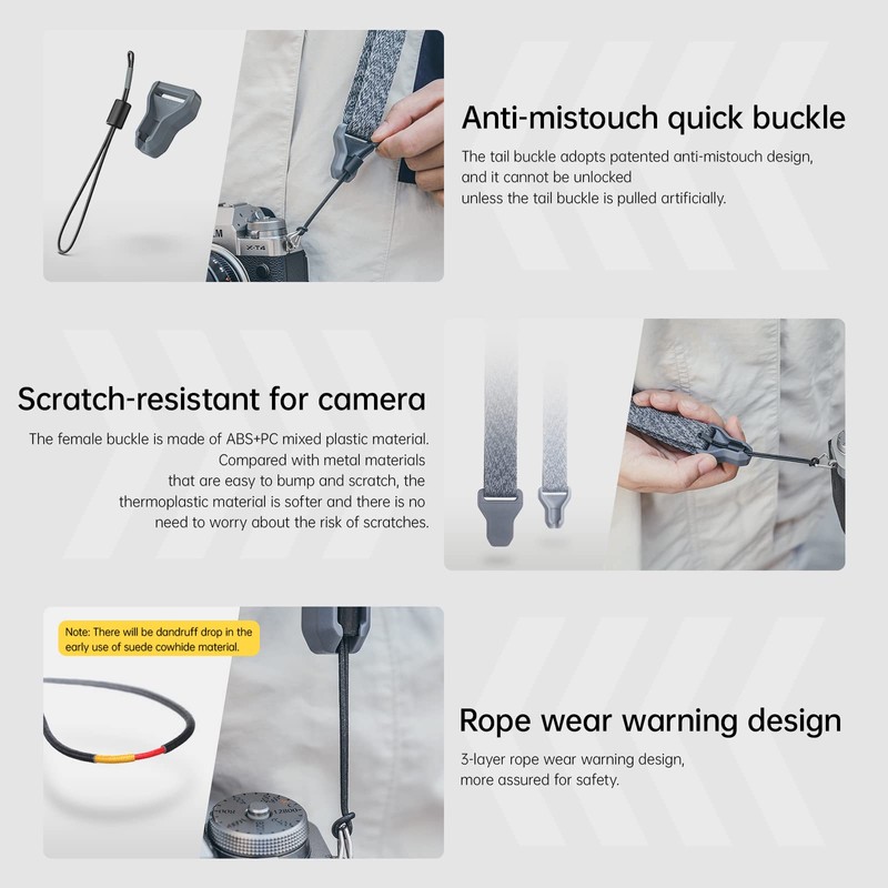- Scratch-resistant for camera: The female buckle is made of ABS+PC mixed plastic material, Compared with metal materialsthat are easy to bump and scratch, the thermoplastic material is softer and there is noneed to worry about the risk of scratches