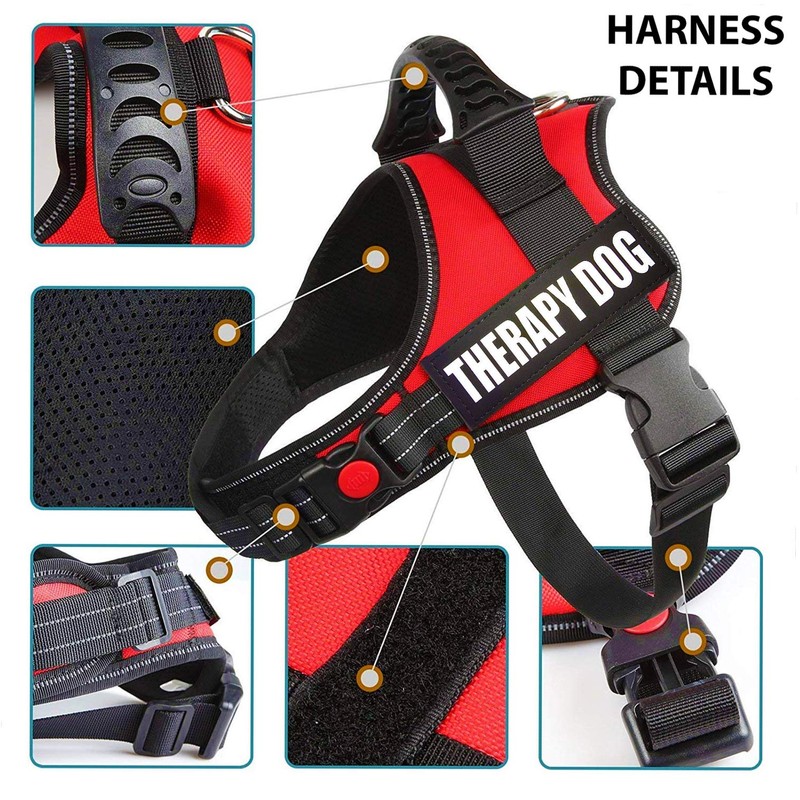 • ROBUST DESIGN AND CRAFTSMANSHIP - Made from sturdy, lightweight, high quality oxford material, with removable high-quality Velcro "THERAPY DOG" patches, a stainless-steel D-Ring for leashes and ID tags, beautiful bright color, reflective wording and stitching stand out at night and ensure safety. This Therapy dog harness jacket is a must have item for your working dog’s wardrobe.