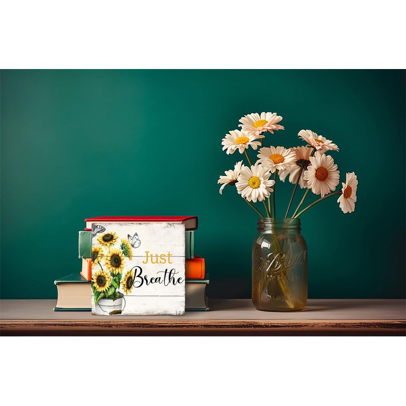 "Just Breathe" Wooden Block Sign - 5x5 Inch Rustic Sunflower Decor with Inspirational Quote for Home, Office, or Shelf