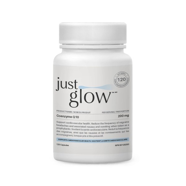 Just Glow Naturally: Coenzyme Q10 200mg - 120 Capsules - CoQ10 Ubiquinone Supplement - Experience the Power of a Natural Antioxidant for Supporting Cardiovascular Health and Alleviating Migraines & Headaches - Made in Canada - 120 Days Supply
