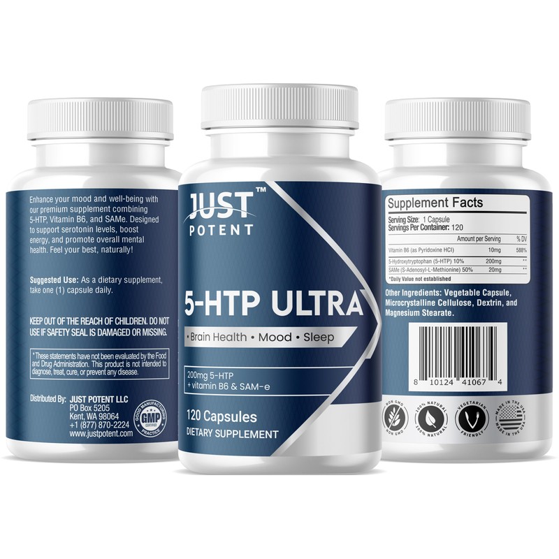 Just Potent Just Potent 5-HTP Ultra 200mg | 120 Capsules - 4-Month Supply | for Sleep, Mood, and Brain Health | Fortified with SAM-e and Vitamin B6