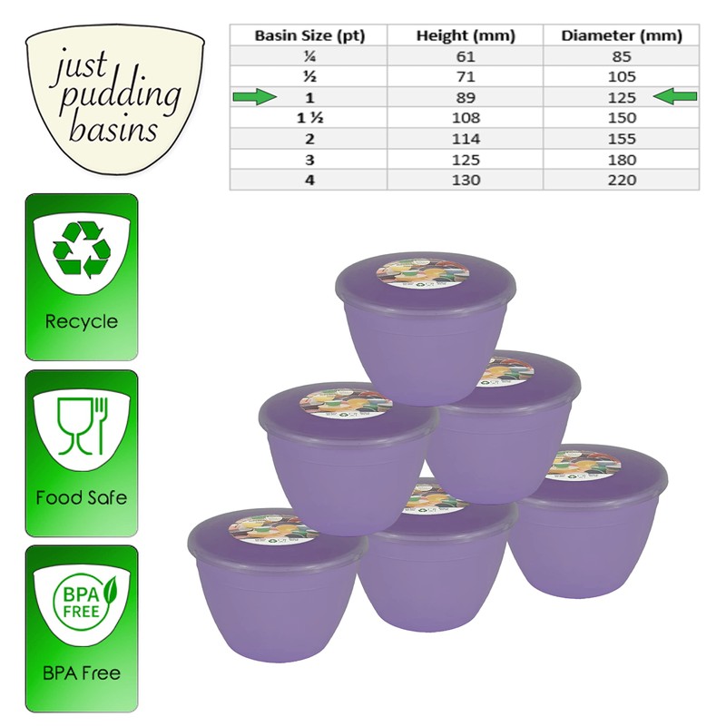 Just Pudding Basins Pastel Colours Lilac 1 Pint Basin and Clear Lid Pack of 6 Plastic Pudding Steaming Bowls