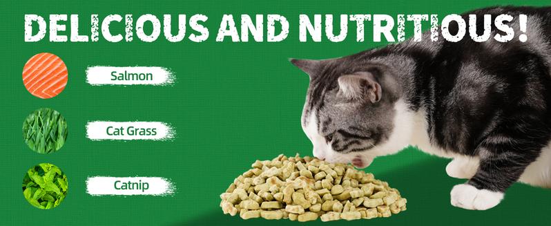 - Ingredients: Wheat flour, Salmon, Barley seedling powder (cat grass), Lecithin, Catnip powder, Bicarbonate, Baking powder, Vitamin C, Vitamin E