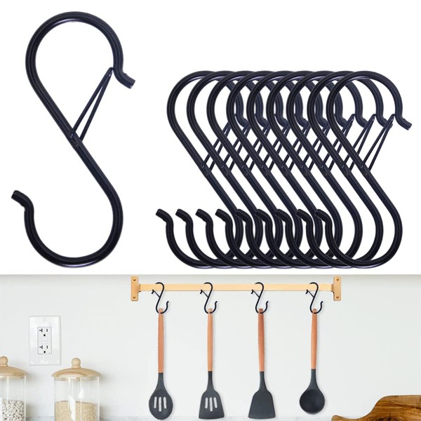 JUSTBOKU S-Shaped Hooks, Fall Prevention, Rust, Load Capacity 22.0 lbs (10 kg), S Hooks, Bath and Kitchen, Set of 10, Black