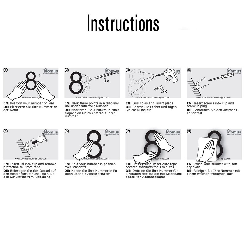 - EASY FITTING, FIXINGS INCLUDED PLUS STEP BY STEP INSTRUCTIONS: House numbers can be fitted to bricks, masonry, wood, concrete or metal. Wall plugs, screws and hidden standoffs included along with easy to follow instructions.
