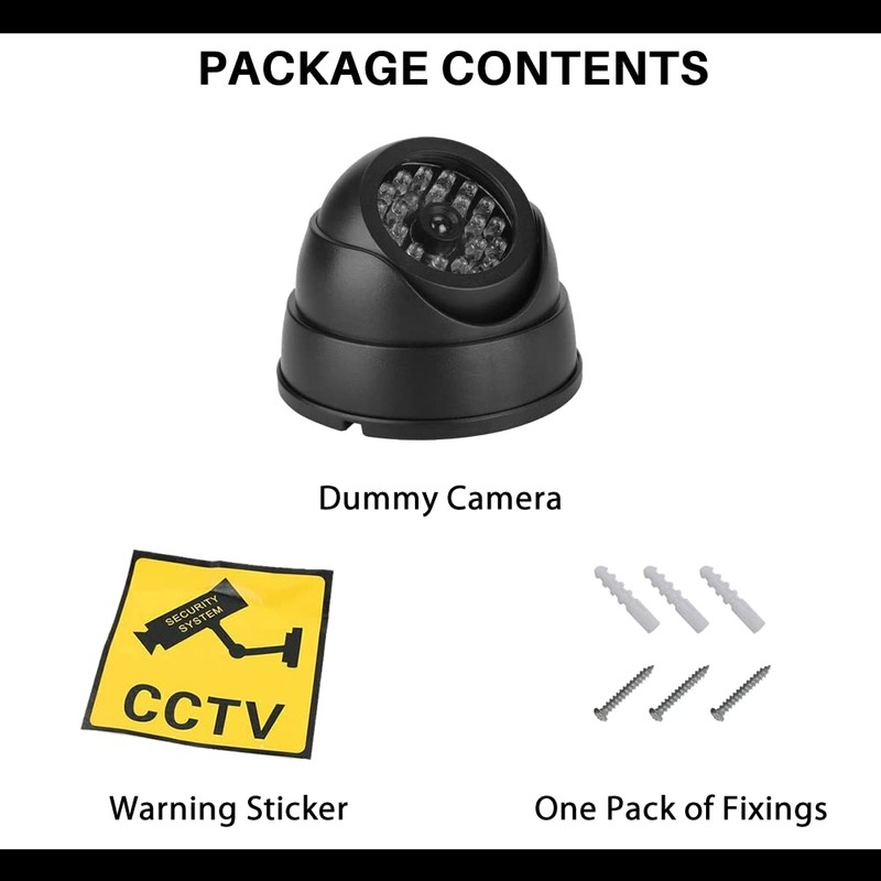 - Black Dome Dummy Surveillance Security CCTV Camera with flashing red LED light, powered by 2 xAA batteries (not included);