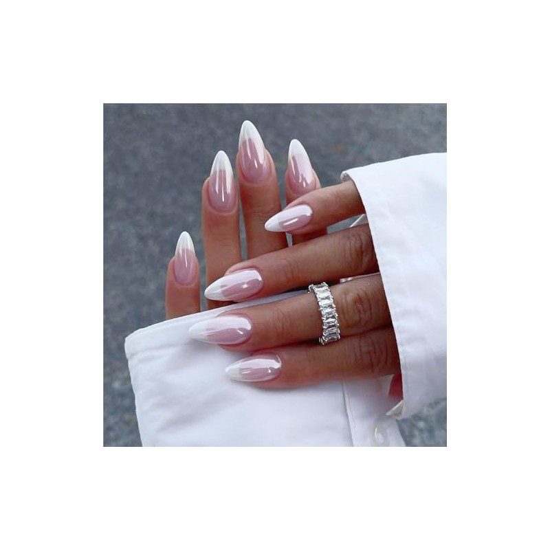JUSTOTRY 24 Pcs Aurora Almond Short Fake Nails Pattern,White and Pink Press on Nails,Glossy Chrome False Nails Medium for Nails Art,French Oval Stick on Nails for Women Gifts